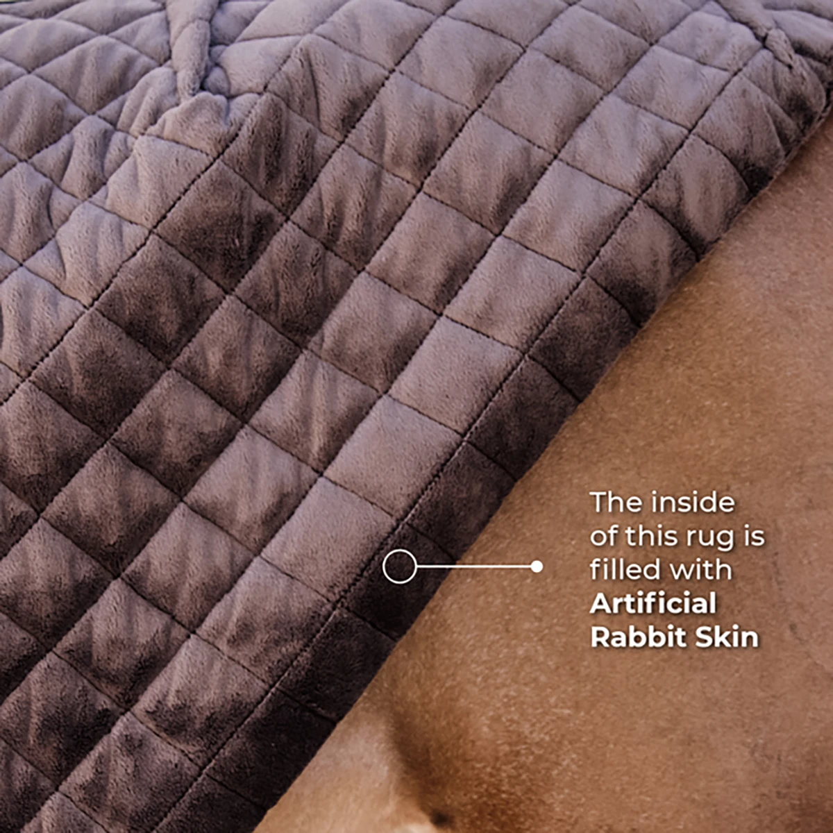 - zachte voering van artificieële konijnenvacht, deze imitatie konijnenvacht voering is zeer zacht en zorgt voor extra warmte doordat het kleine luchtbelletjes creëert die de lichaamswarmte van het paard beethouden