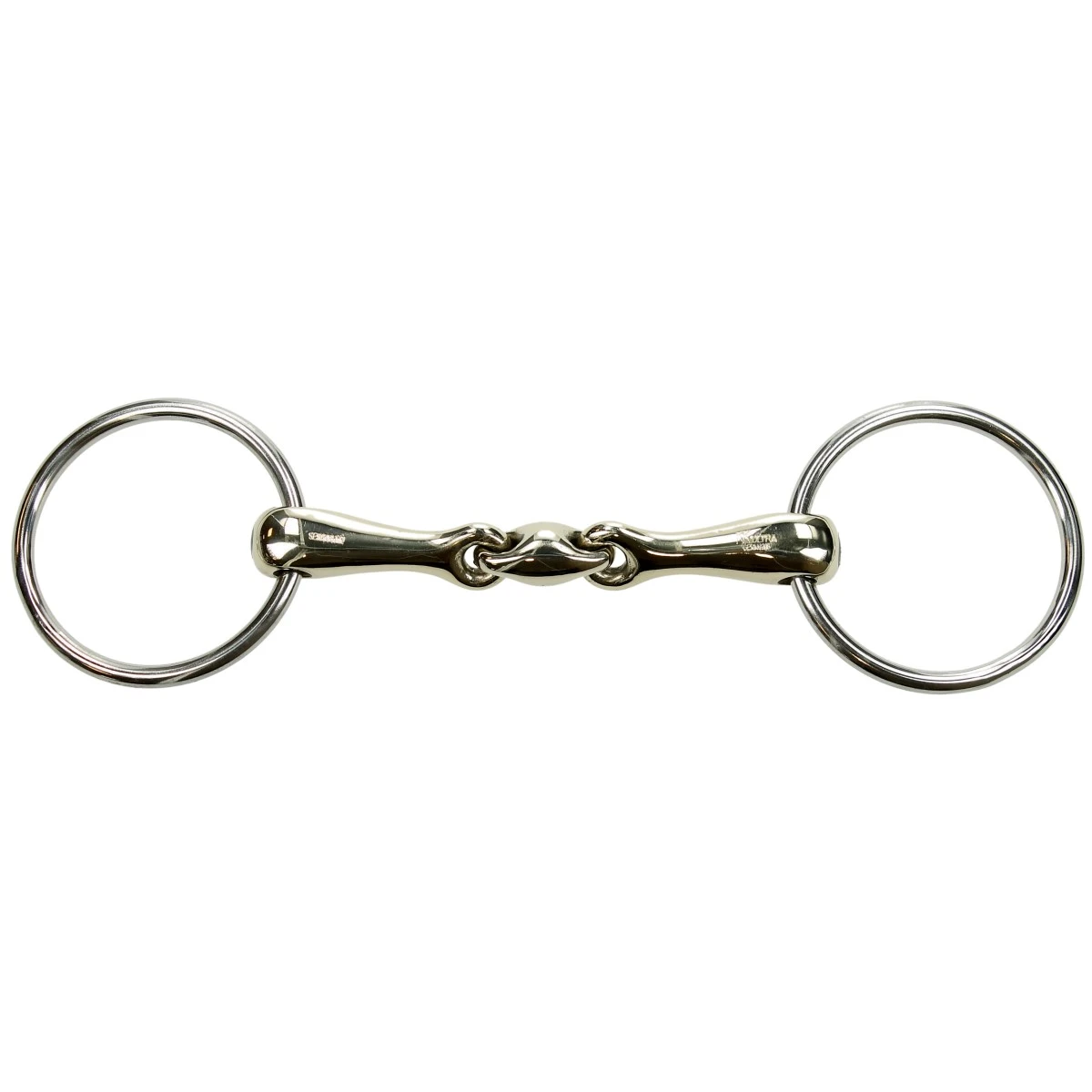 - het middenstuk is kort en schuin naar voren gedraaid met een hoek van 45 graden, wat het een vriendelijk bit maakt en het gehemelte vrij laat
